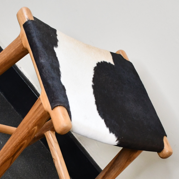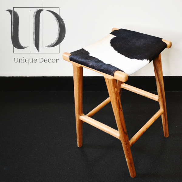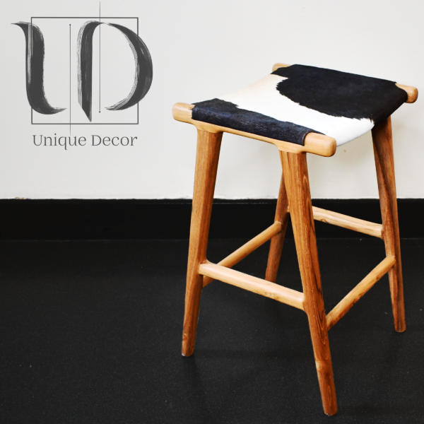 Introducing the Teak Bar Stool, a masterful creation that brings together the natural beauty of teak wood and the rustic charm of cowhide. This bar stool is meticulously handcrafted from premium teak wood, renowned for its durability and rich grain patterns. The seat, upholstered in luxurious cowhide, provides a unique contrast to the warm tones of the teak, resulting in a sophisticated and timeless piece of furniture. Each stool is a unique work of art, showcasing the natural variations in the cowhide and the exquisite craftsmanship of the teak frame.