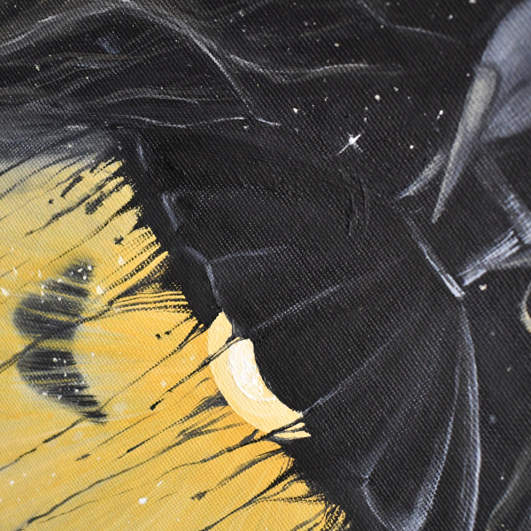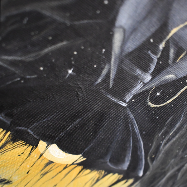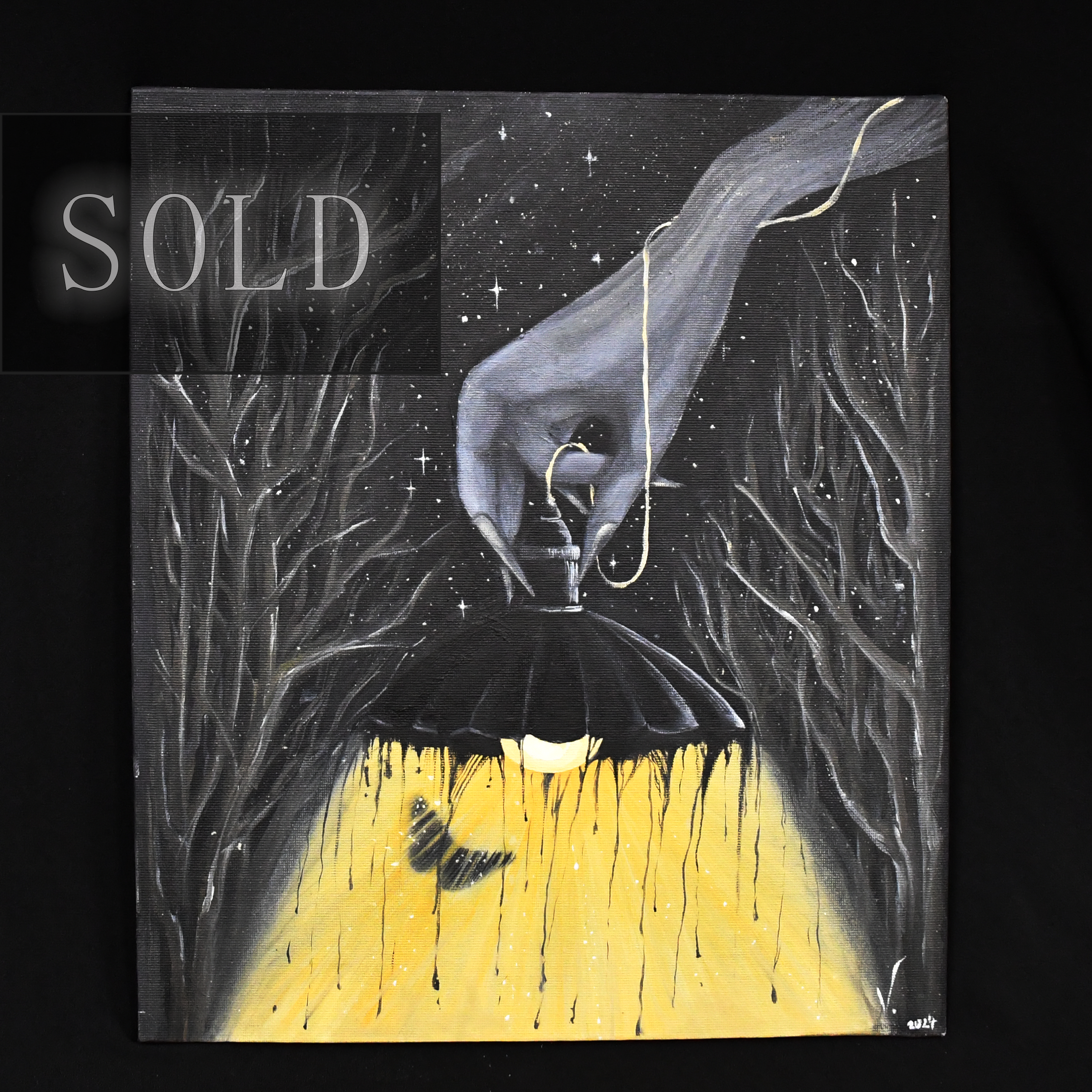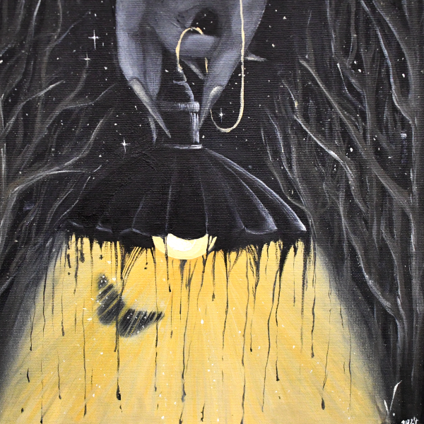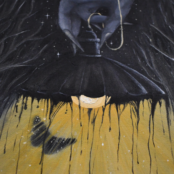 Painted with oil on canvas, Illuminated Fragility captures the delicate interplay between light and darkness. The piece features a glowing lampshade that drips with golden illumination, while a butterfly hovers in its gentle embrace, symbolising transformation and fleeting beauty. The hand above, almost ethereal, controls the light, adding a mysterious and philosophical element to the artwork.